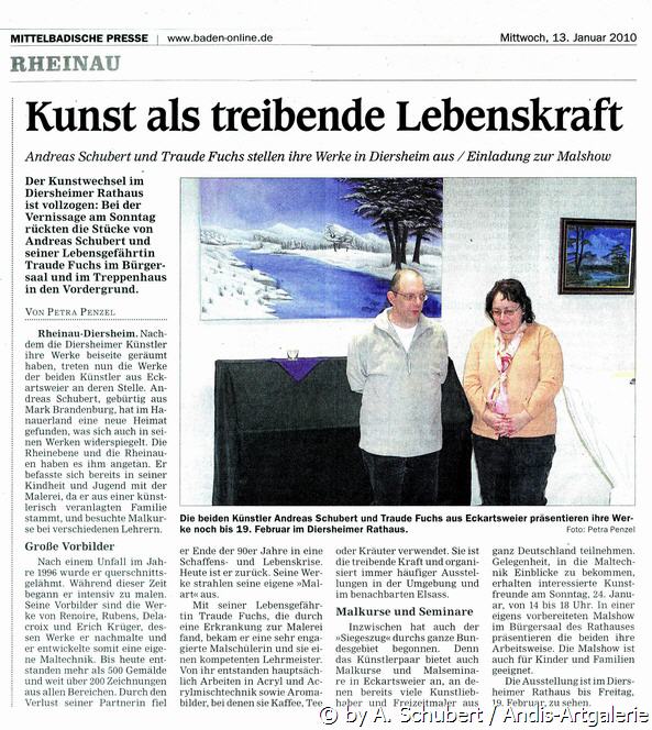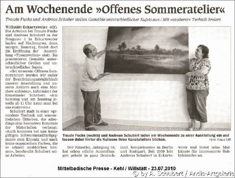 Die Ausstellung "Traumwelten" von Andreas Schubert und Traude Fuchs wurde vom 01.07. bis 30.09.2009 im Altenheim "Sonnenhaus Geng" in Kehl Kork gezeigt.